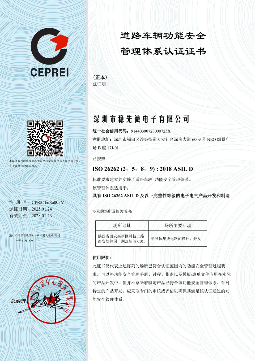 圖 | 穩(wěn)先微 ISO26262 ASIL D級管理體系認證證書